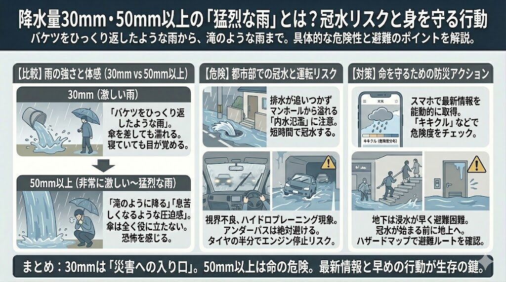 降水量30mm・50mm以上の「猛烈な雨」とは?冠水リスクと身を守る行動