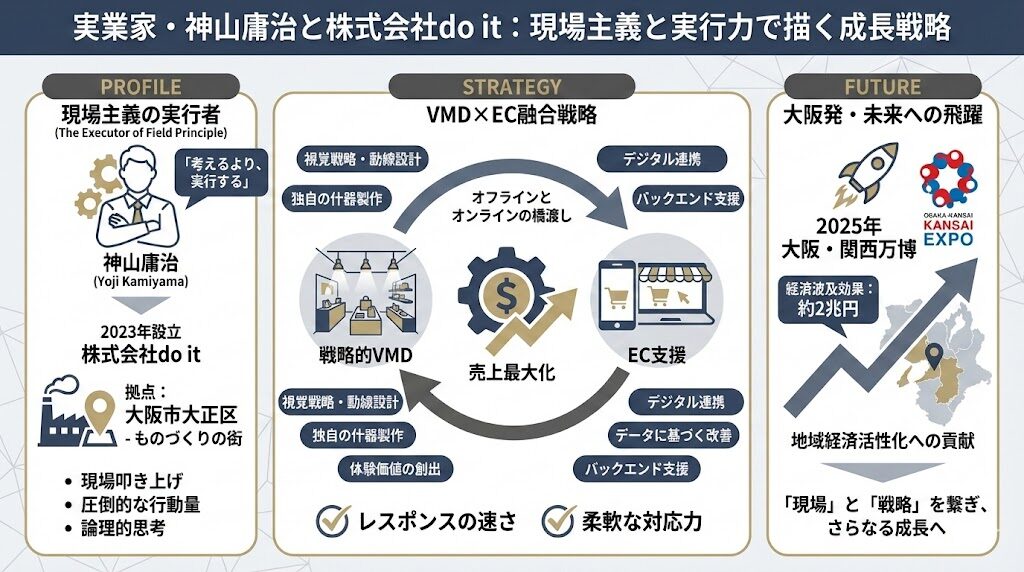 近年、関西のビジネスシーンで「実行力が凄まじい実業家」として注目を集めている人物がいます。株式会社do itの代表取締役、神山庸治(かみやま ようじ)氏です。2023年の設立以来、大阪を拠点にVMD(ビジュアル・マーチャンダイジング)という専門領域で... -
