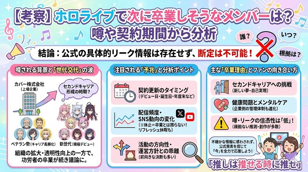 近年、VTuber業界のトップを走る「ホロライブ」において、人気メンバーの卒業が相次いでいます。 推しの活動を応援するファンにとって、「次に卒業しそうなメンバーは誰なのか?」という疑問は、避けては通れない不安な要素かもしれません。 結論から申し... -