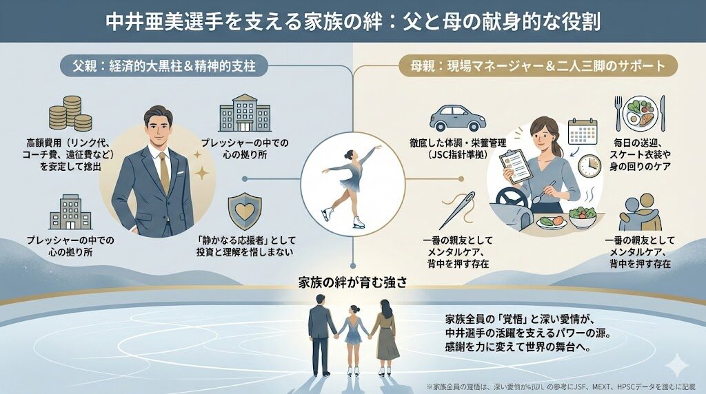 女子フィギュアスケート界で、トリプルアクセルを武器に次世代のエースとして注目を集める中井亜美選手。 その華麗な演技と愛らしいルックスの裏で、彼女を支え続けている「両親」の存在が気になっている方も多いのではないでしょうか。 結論から申し上げ... -