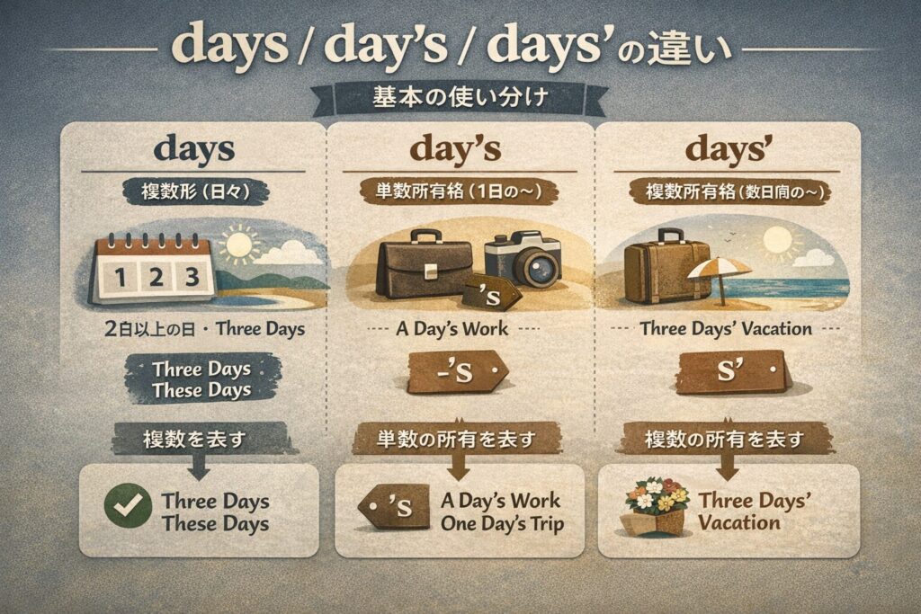 - 基本の使い分け:アポストロフィのない「days」は純粋な複数形(日々)を指し、アポストロフィのある「day’s」は単数の所有格(1日の〜)、「days’」は複数の所有格(数日間の〜)を指します。