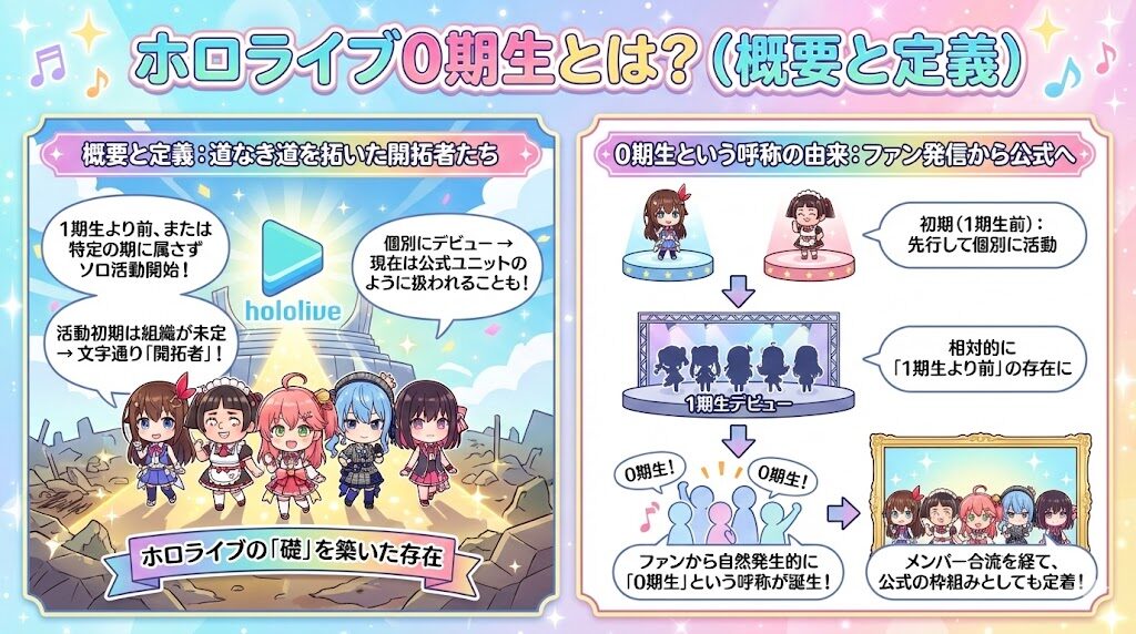 ホロライブ0期生とは、カバー株式会社が運営するVTuberグループ「ホロライブ」において、1期生よりも前、あるいは特定の期に属さずソロで活動を開始したメンバーの総称です。