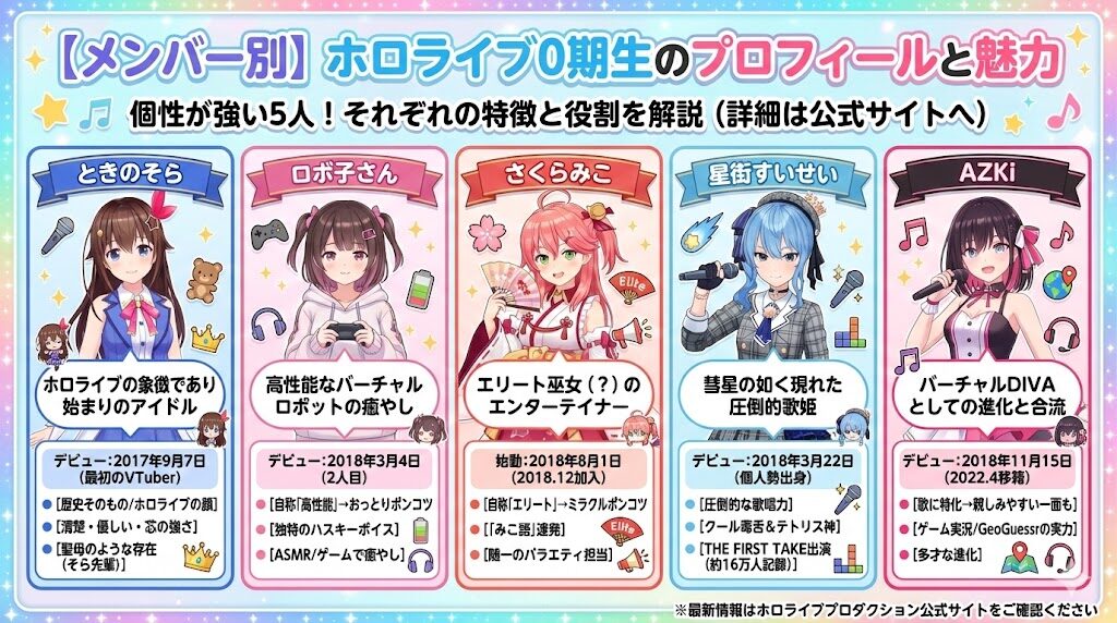 ホロライブ0期生は、ときのそら、ロボ子さん、さくらみこ、星街すいせい、AZKiの5人によって構成される、ホロライブの原点です。