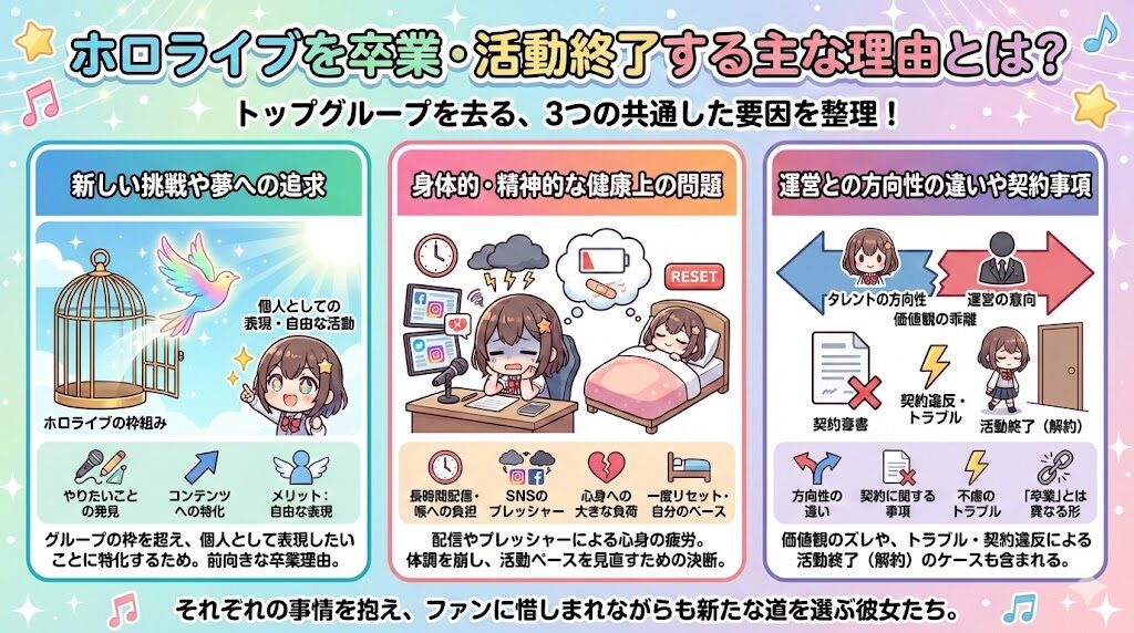まずは、なぜ彼女たちがトップグループであるホロライブを卒業することを選んだのか、その主な要因を整理してみましょう。