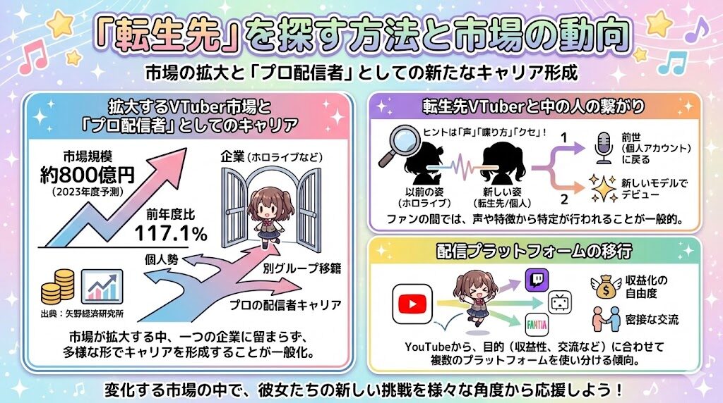 このように市場が拡大する中で、一つの企業に留まらず、個人勢や別グループへの移籍を含めた「プロの配信者」としてのキャリア形成が一般化しています。