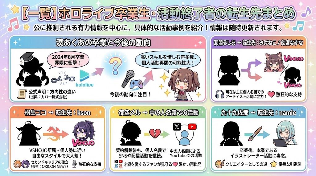 本記事では、湊あくあさんをはじめとするホロライブ卒業生の「その後」について、気になる転生先や活動状況を網羅的にまとめました。