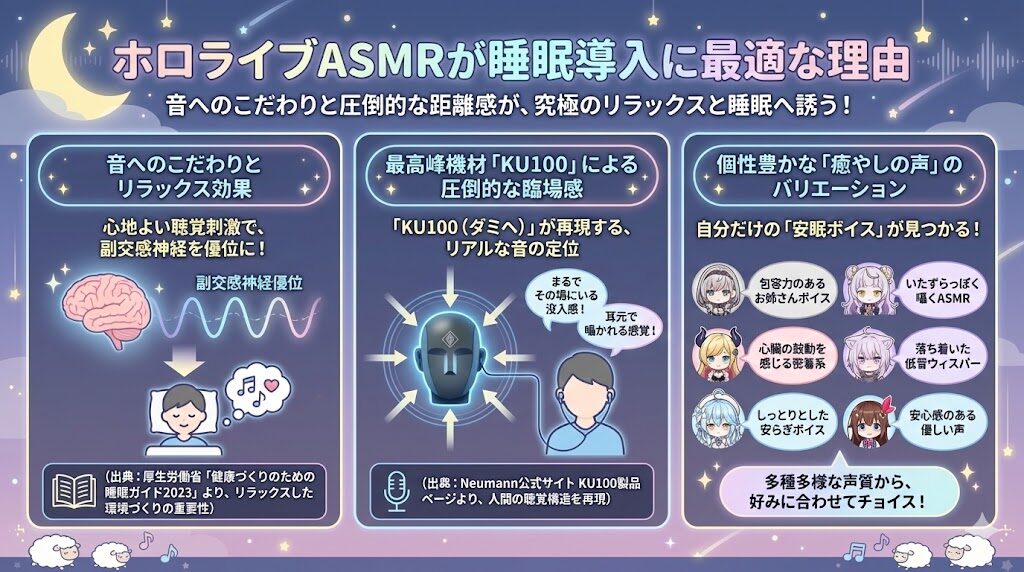 ホロライブのVTuberによるASMR配信が、なぜこれほどまでに多くの視聴者を虜にし、睡眠へと誘うのかには明確な理由があります。