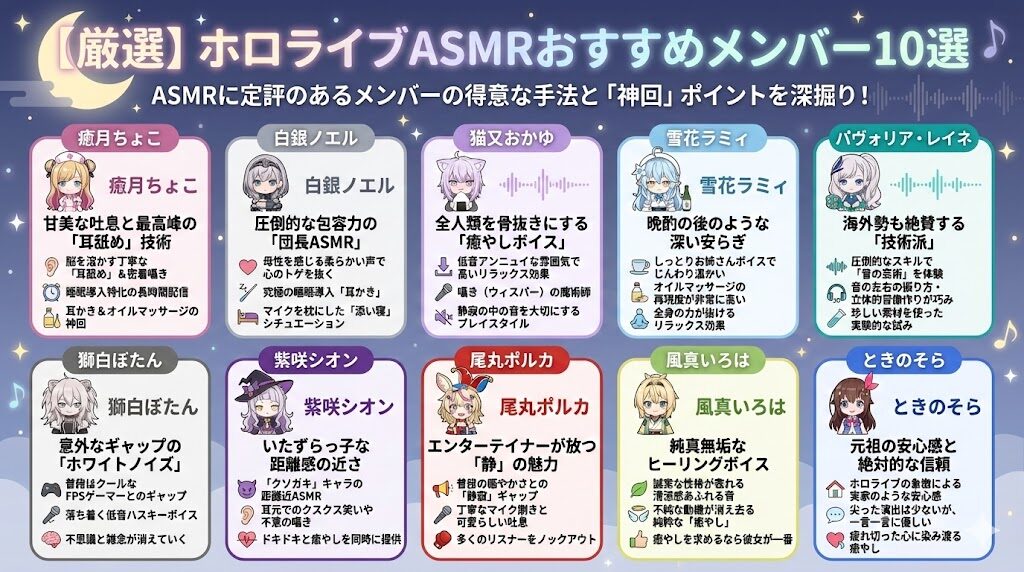 本記事では、特に睡眠導入やリラックス効果が高いと評判のホロライブメンバー10選と、絶対に聴くべき「神回」を厳選してご紹介します。