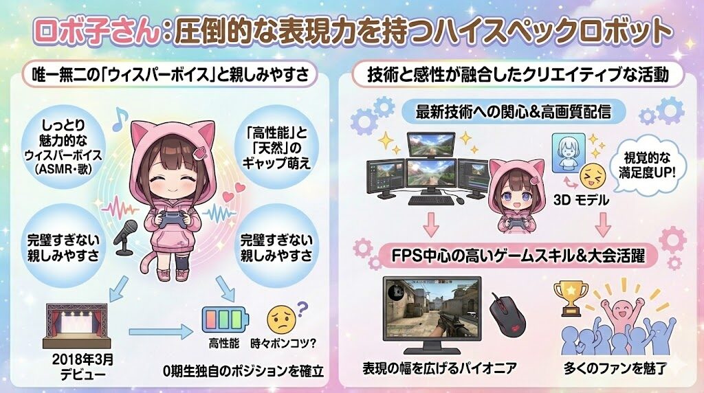 ロボ子さんの最大の特徴は、一度聴いたら忘れられない、しっとりとした魅力的なウィスパーボイスです。