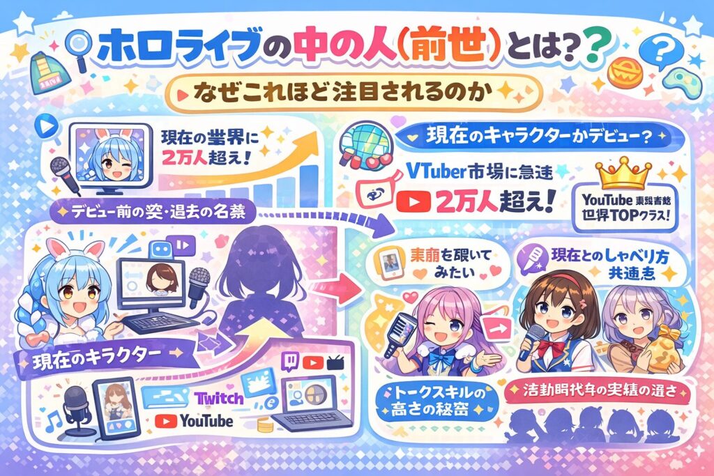 今や世界的な人気を誇るVTuberグループ「ホロライブ」ですが、その華やかなアバターの裏側にいる「中の人(前世)」への関心は絶えません。