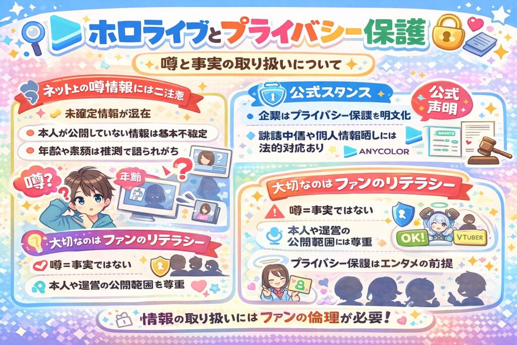なお、VTuberのプライバシー保護に関しては、運営会社であるカバー株式会社と株式会社ANYCOLORが共同声明を発表し、誹謗中傷やプライバシー権の侵害に対して法的措置を含む厳正な対応を行う方針を明確にしています。 (参照:誹謗中傷等の行為に対する連携体制の構築について)