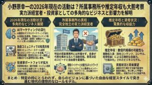 小野原幸一の2026年現在の活動は?所属事務所や推定年収も大胆考察 2026年現在、実業家や投資家として注目を集める小野原幸一氏がどのような活動をしているのか、気になっている方は多いのではないでしょうか。 結論からお伝えすると、小...