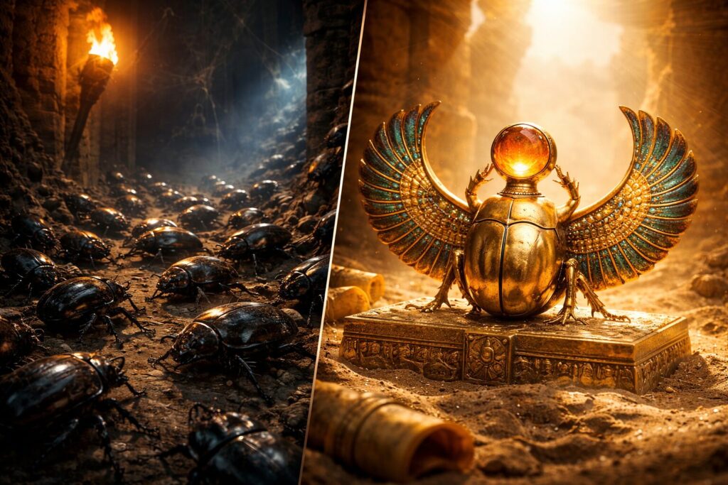 映画制作者たちは、この「死者の副葬品として大量に納められていた」という歴史的事実を逆手に取り、本来は守護のために置かれたスカラベを、侵入者を拒む攻撃的なトラップとして再解釈しました。歴史的な聖性を恐怖へと転換させたこの演出は、エンターテインメントとしては大成功でしたが、スカラベの名誉を著しく傷つける結果となったのは否定できません。